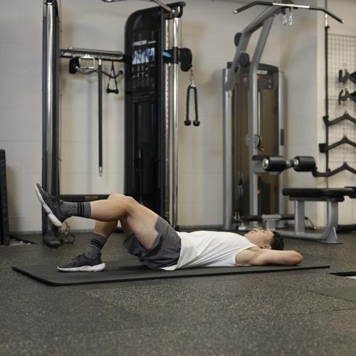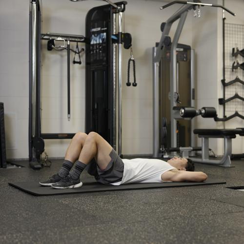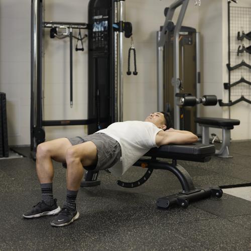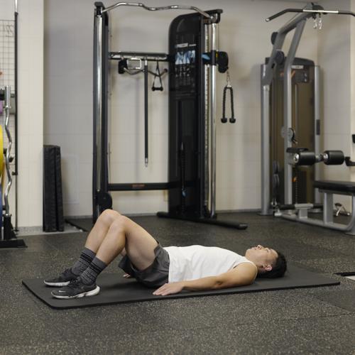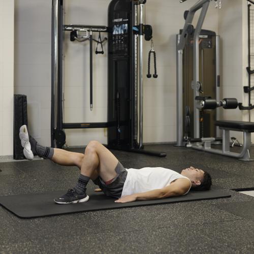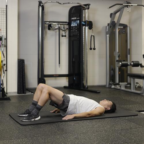 両足で身体を支えて床を押しながら、お尻を引き上げると、筋肉に効きやすくなります。重量を上げる際は、正しいフォームでおこなえるか確認しながらおこないましょう。
