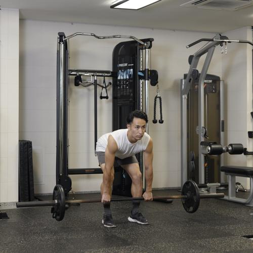 「ルーマニアンデッドリフト」の際はひざは軽く曲げ、背中を丸めずに股関節の動きを意識するのがポイントです。動作域は無理に広げず、ハムストリングスの張りを感じる位置で十分です。