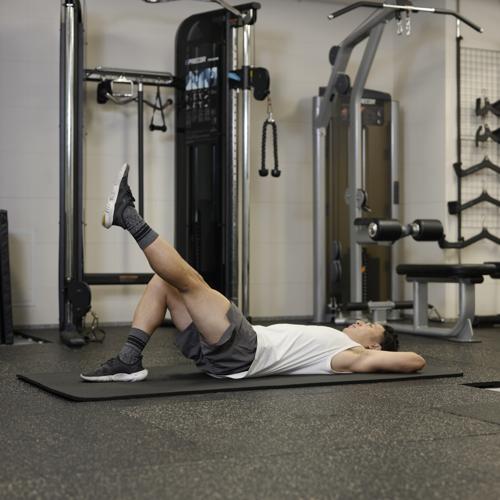 - 仰向けに寝て片足を床につけ、もう片脚は天井に伸ばす