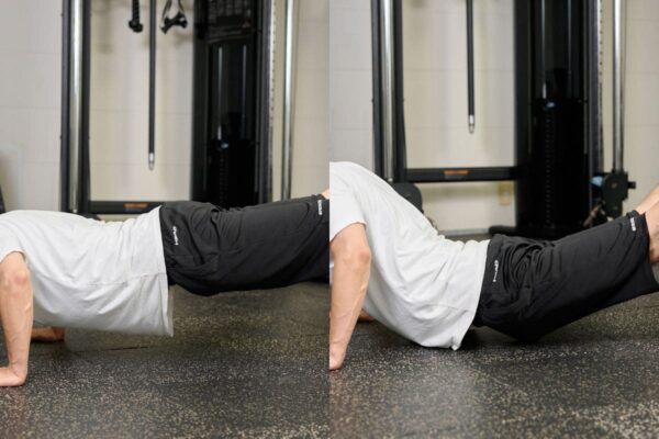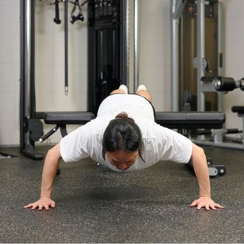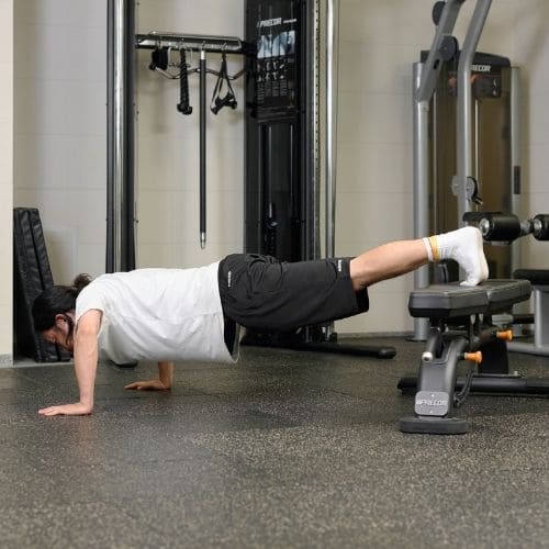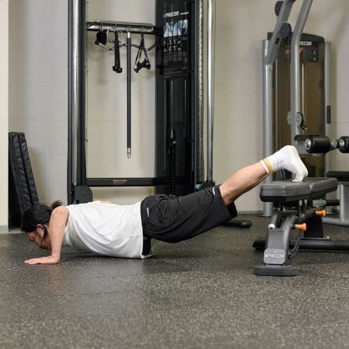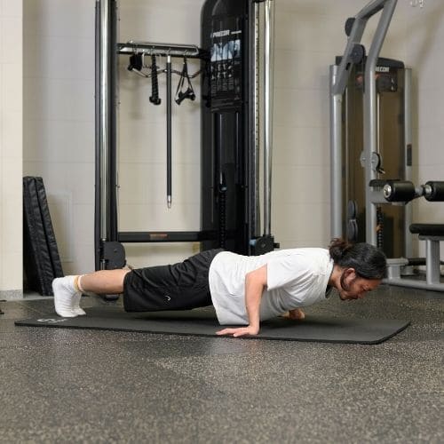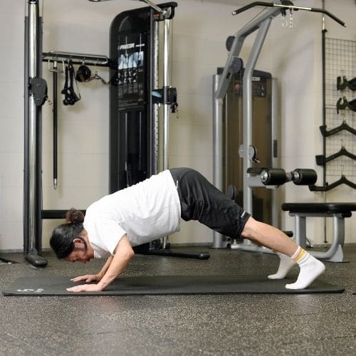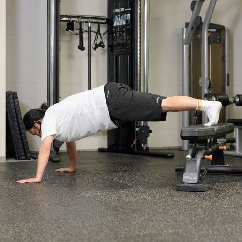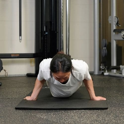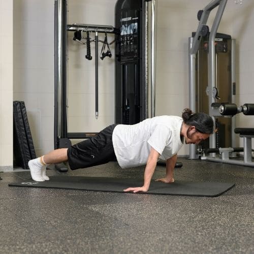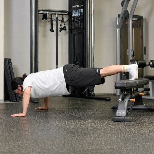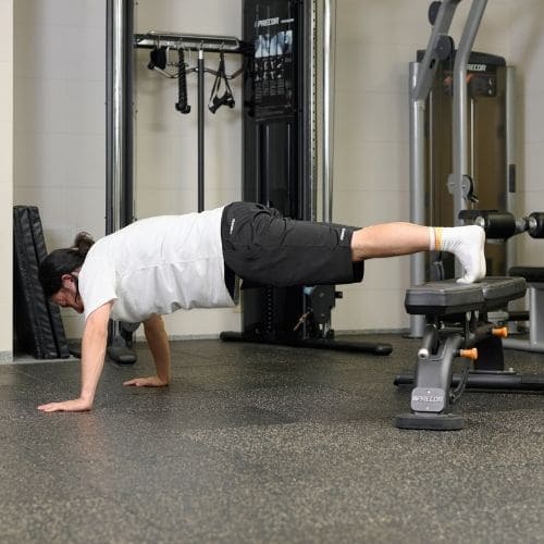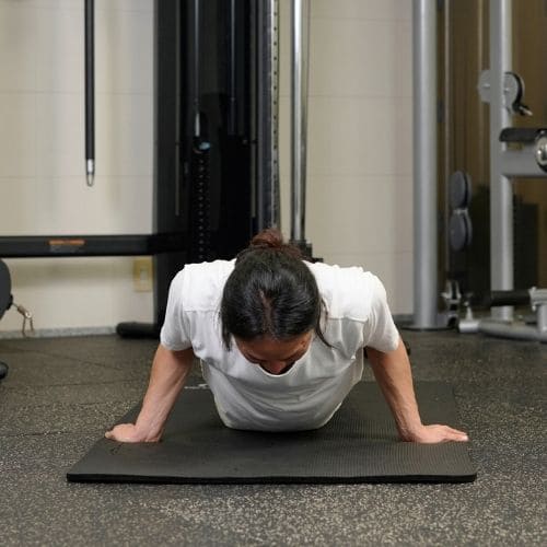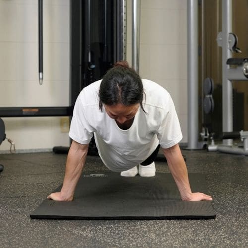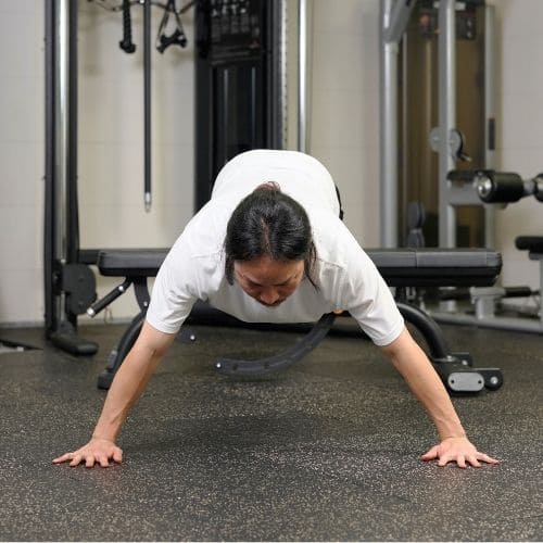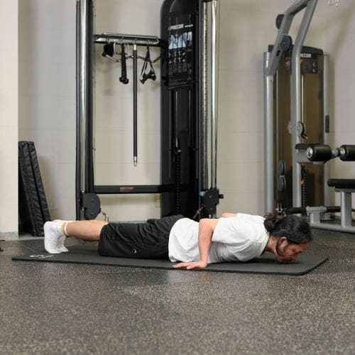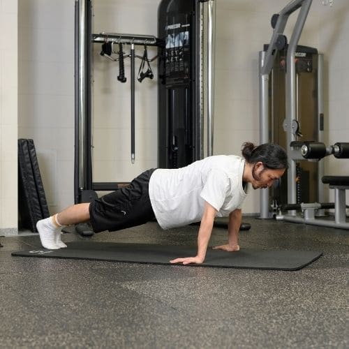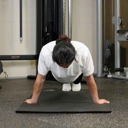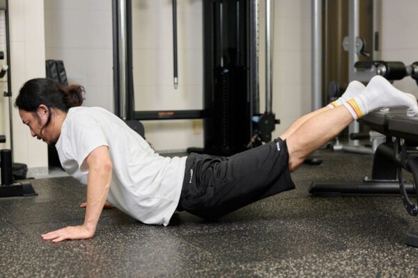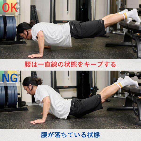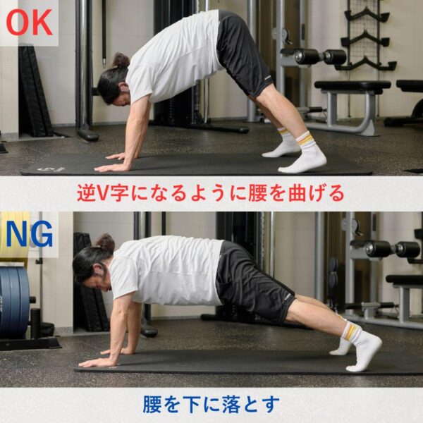 - 手は肩幅程度に開き、足を後方に伸ばして腕立て伏せの体勢を取る