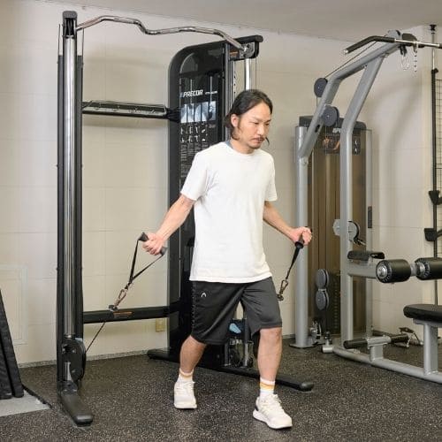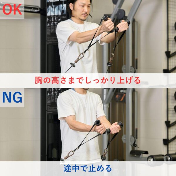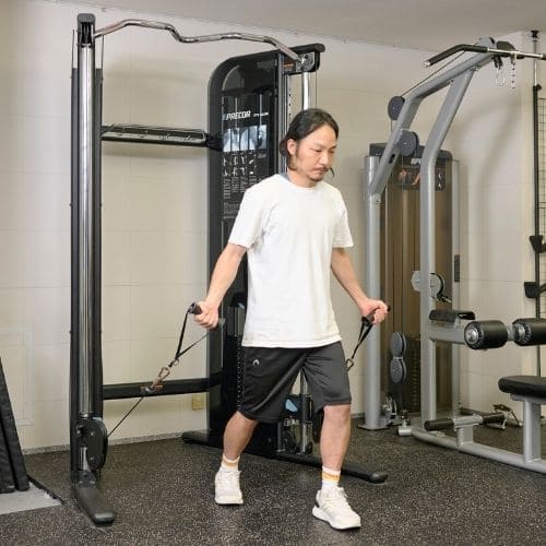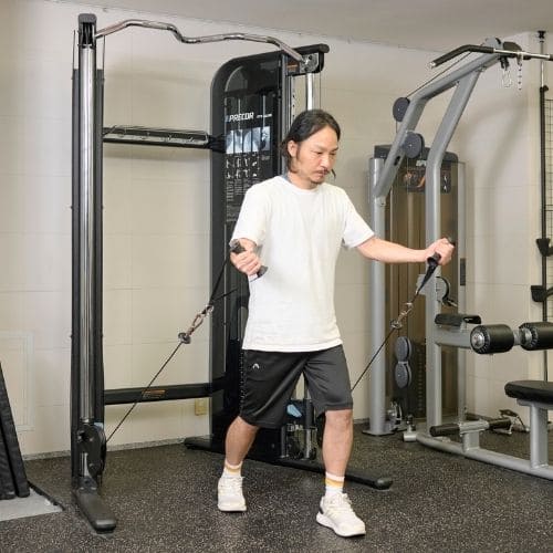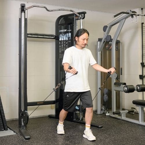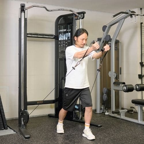 プーリーを低くすると上向きに引く意識が強くなりますが、回数が進むほど肩がすくみやすく、狙いが三角筋に流れやすいと感じました。左右の張力差があると軌道がブレて、フィニッシュで胸の中央に集める感覚を失いやすかったです。