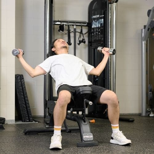 8〜12回×3セットの目安だと、自分は片手13kgでした。初心者として軽めですが、テンポを落としてていねいに動かすと上部にしっかり効きました。無理に重くするとフォームが乱れて肩にきます。