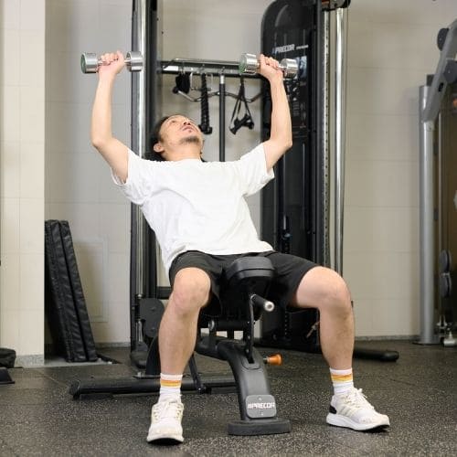 最初の頃はダンベルを下げる位置が浅く、ただ上下に動かしているだけになっていました。ひじの角度や下ろす位置が曖昧で、結果として肩に負担が偏ってしまうことがありました。