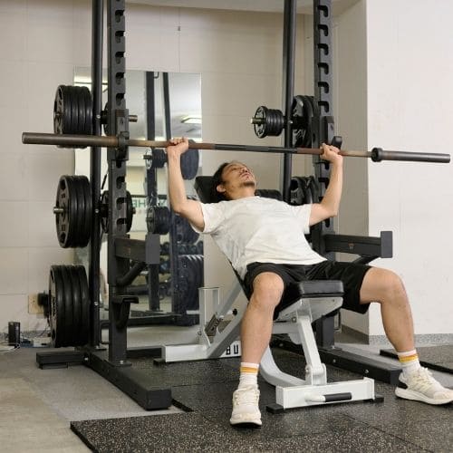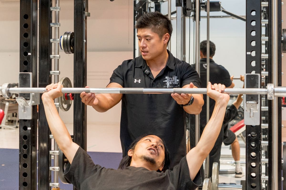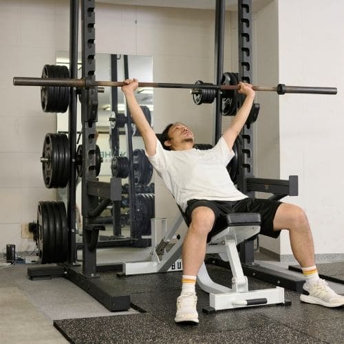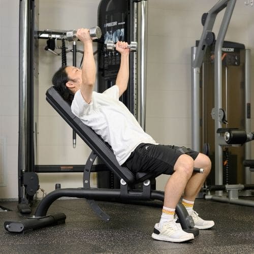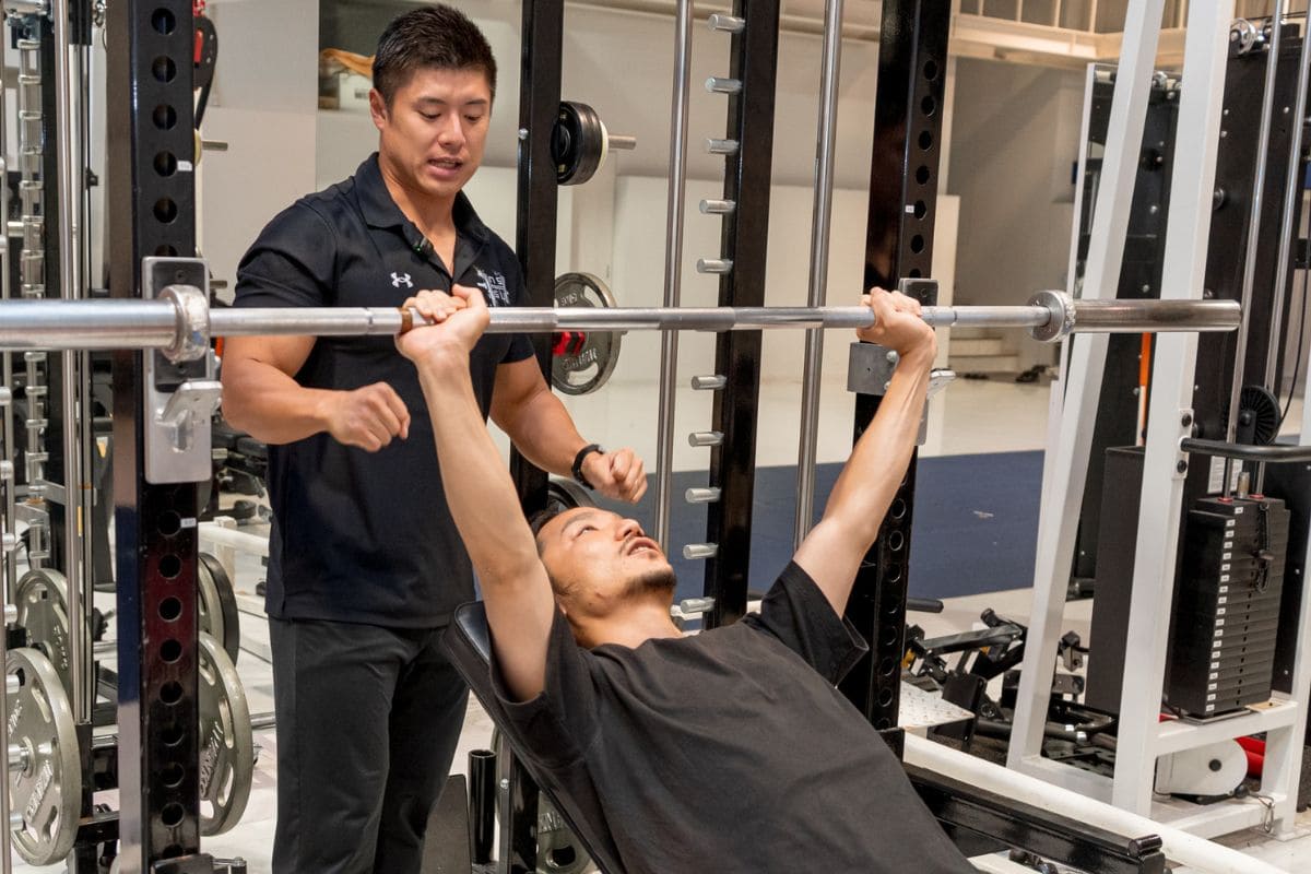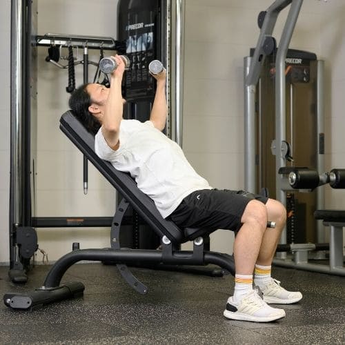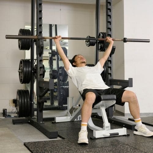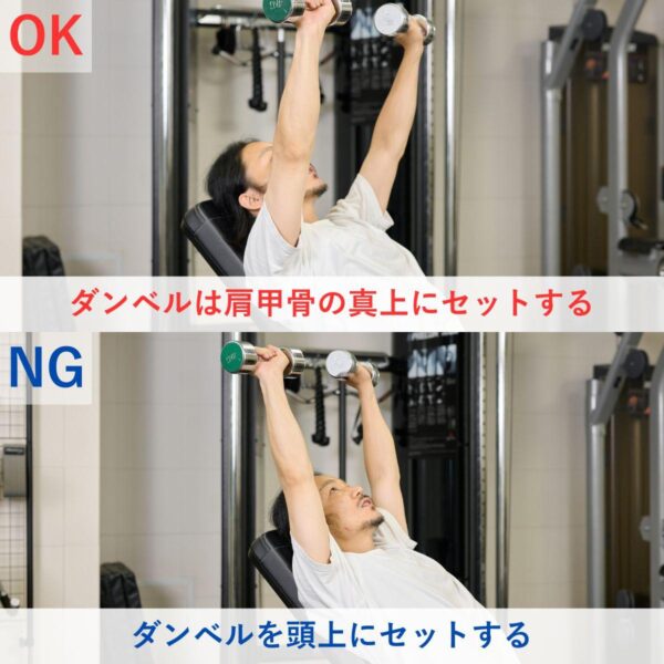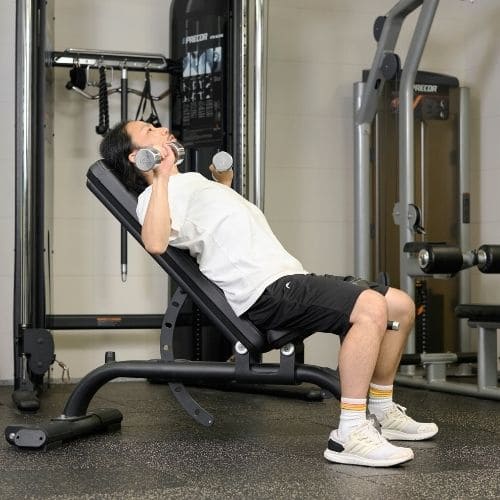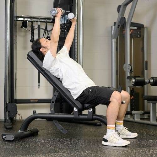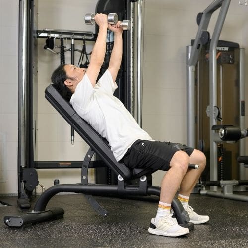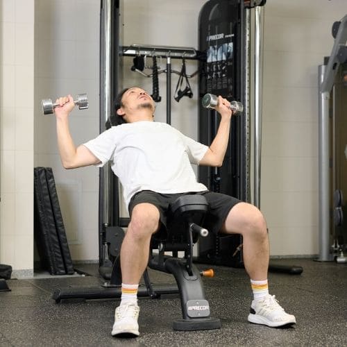 フォームが安定しない場合は、動画などで確認しながら「鎖骨の高さに下ろす」イメージを繰り返すと改善しやすいです。ダンベルの場合は可動域を意識しやすいため、最初はフラットではなくインクラインの軽重量ダンベルプレスから習得するのもおすすめです。