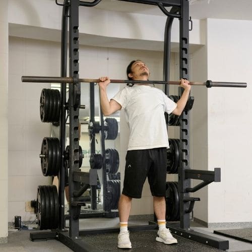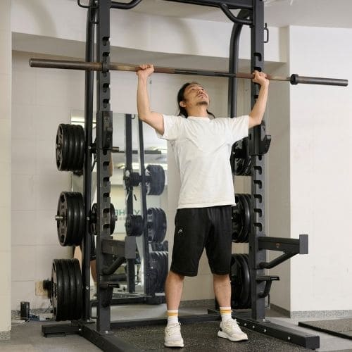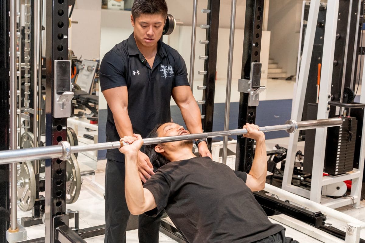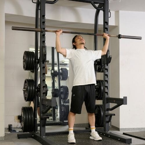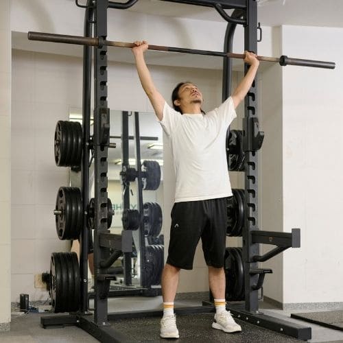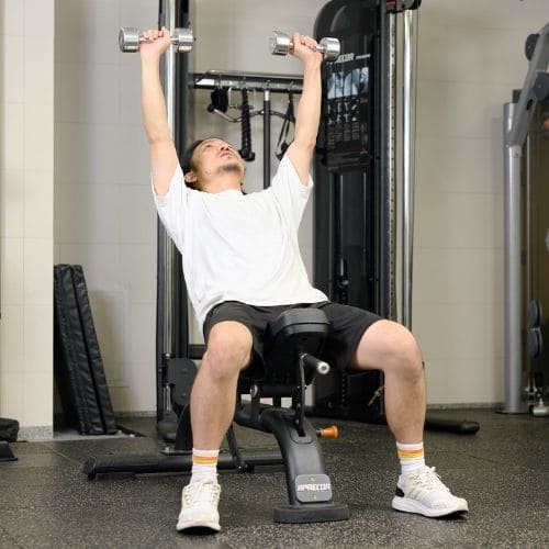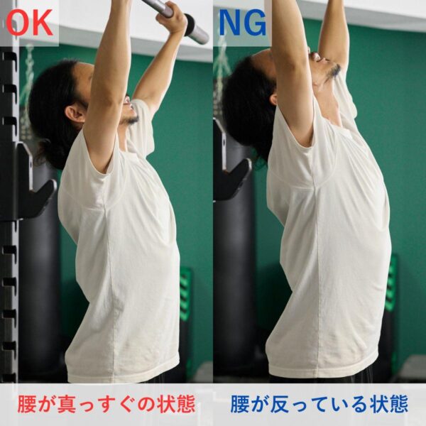 主働は三角筋で胸上部は補助です。お腹を軽く引き込み、お尻を締めることで腰の反りを抑え、バーは体の近くをまっすぐ頭上へ持ち上げるようにしましょう。