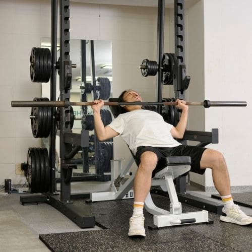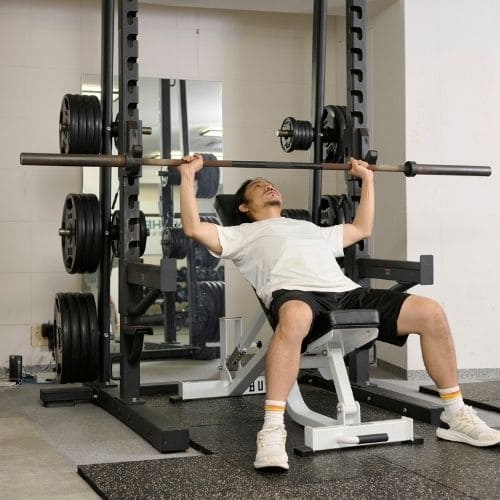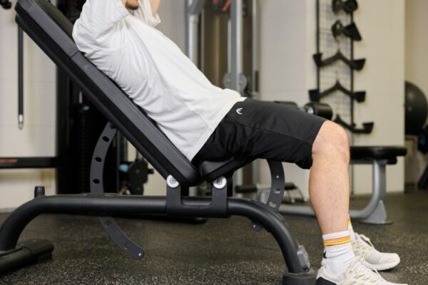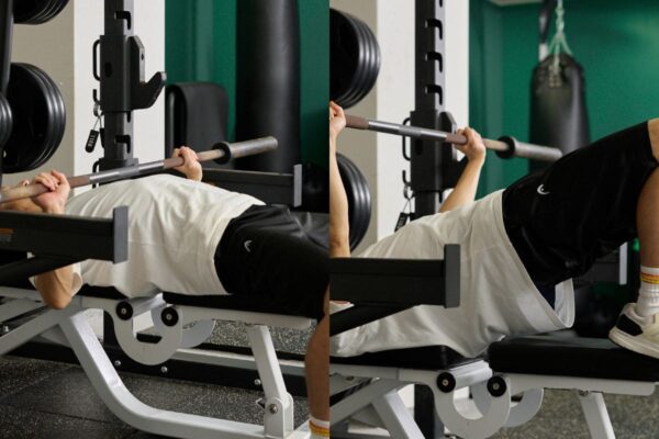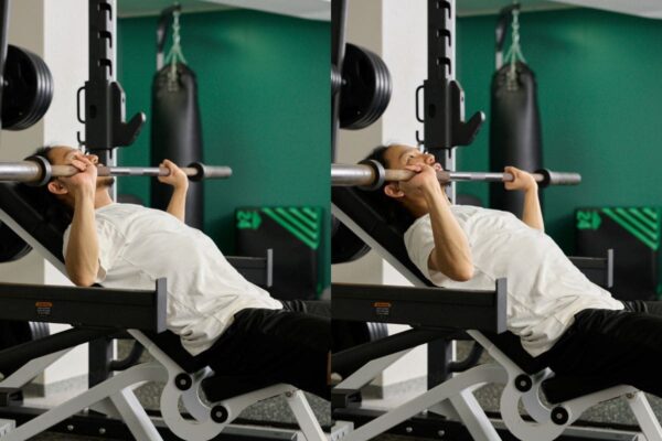 ベンチの角度は重要で、目安は30〜45度です。開始前に肩甲骨を軽く寄せて下げ、胸を高く保ったまま、ひじを落とし・鎖骨の上に押し返す軌道を意識しましょう。