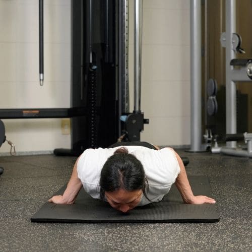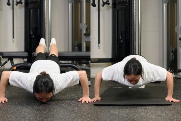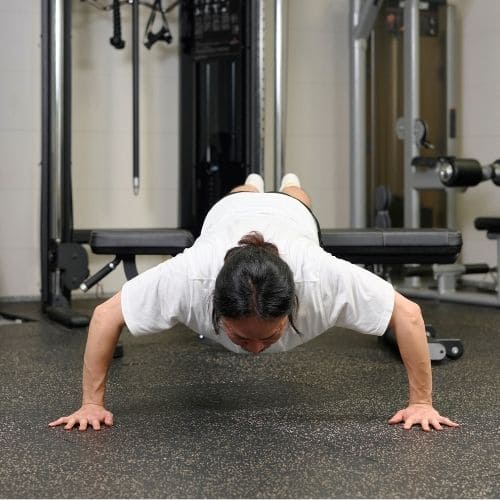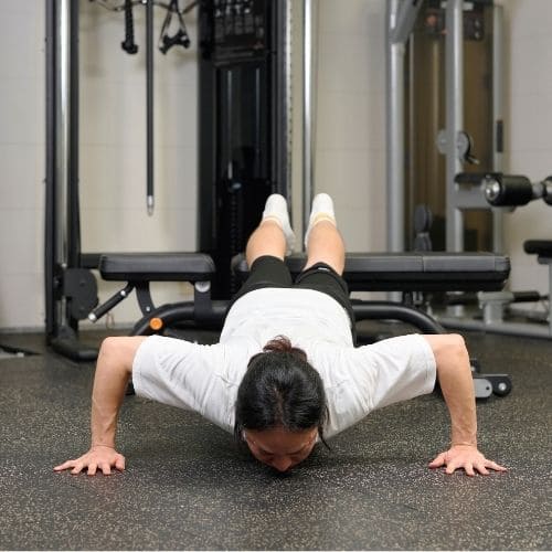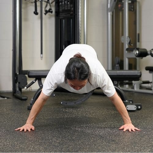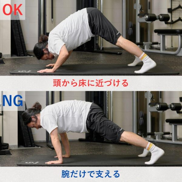 腰が落ちやすい人は、まず台の高さを低めに設定するとフォームが安定しやすくなります。頭ではなく胸を床に向けるイメージを持つことで、大胸筋上部に的確に刺激を届けられます。