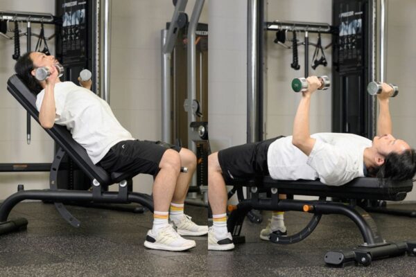 ベンチの角度は30度程度を基本に、違和感があれば浅めからにしましょう。前腕は床と垂直を保ったままで、バーベルを押し上げるように注意してください。右腕はできているけど、左腕はできていないケースなど、左右差がでる人もいます。