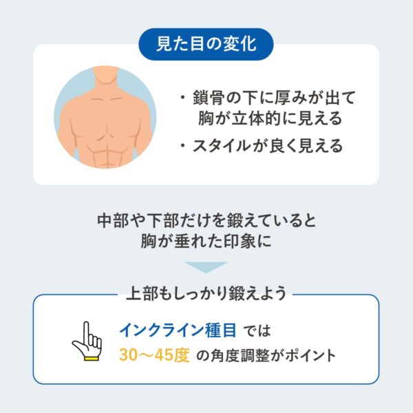 大胸筋上部が発達すると、鎖骨の下に厚みが出て胸が立体的に見える。Tシャツやジャケットを着たときに胸元が引き締まり、スタイルが良く見える効果がある。中部や下部だけを鍛えていると胸が垂れた印象になりやすいため、上部をしっかり鍛えることで全体のバランスが整い、均整の取れた胸板になる。