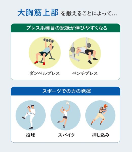 また、胸全体の筋肉量が増えることで基礎代謝の向上につながり、スポーツではボールを上に投げる・押し出す動作などが強化される。