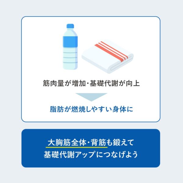 大胸筋は体の中でも大きな筋肉群です。上部だけでなく大胸筋全体・背筋も踏まえて鍛えることで基礎代謝アップは期待できます。胸に厚みを出しつつ背中や下半身も同時に鍛えることで、消費カロリーが増えやすくなります。