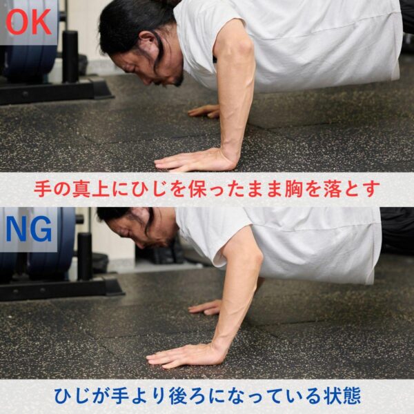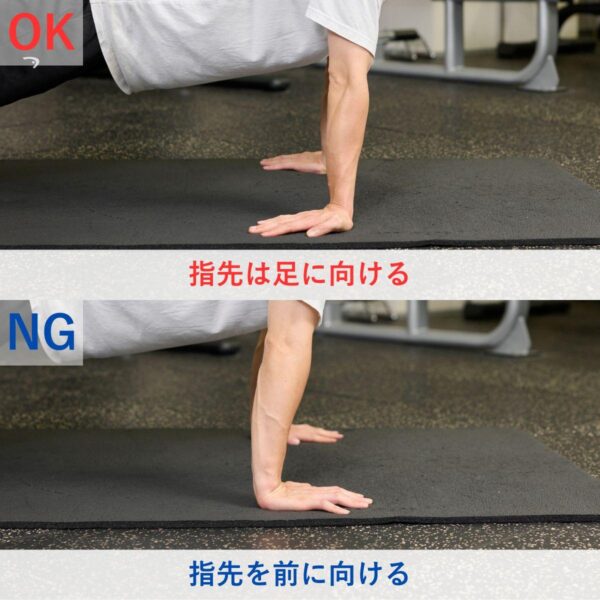 この種目は手首の柔軟性が不足していると安定が取りにくくなります。慣れないうちは無理をせず取り組むようにしましょう。また、上腕三頭筋にも強い刺激を得られます。