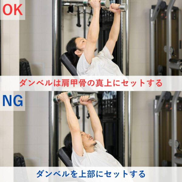 肩を守るには、ベンチ30〜45度・前腕は床に垂直・ひじの真上に手首が来るラインを意識しましょう。開始前に肩甲骨を寄せて下げ、肩がすくまない状態を作ってからセットするとフォームが安定しやすくなります。