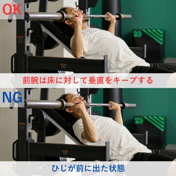 ひじを開きすぎたり、ベンチ角度を立てすぎると肩のケガにつながるリスクが高まる。ベンチ角度は30〜45度に設定し、前腕は地面と垂直な状態で押し出すと手首や肩関節への負担を減らせる。