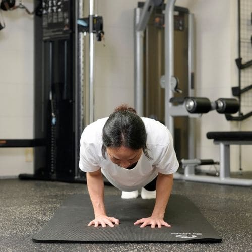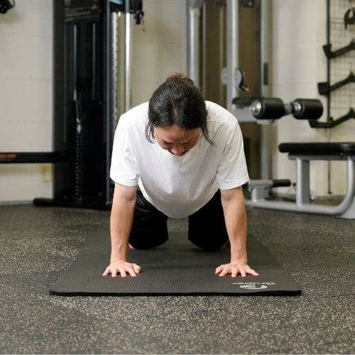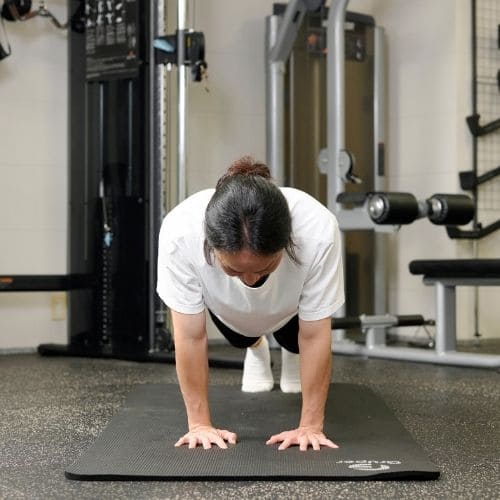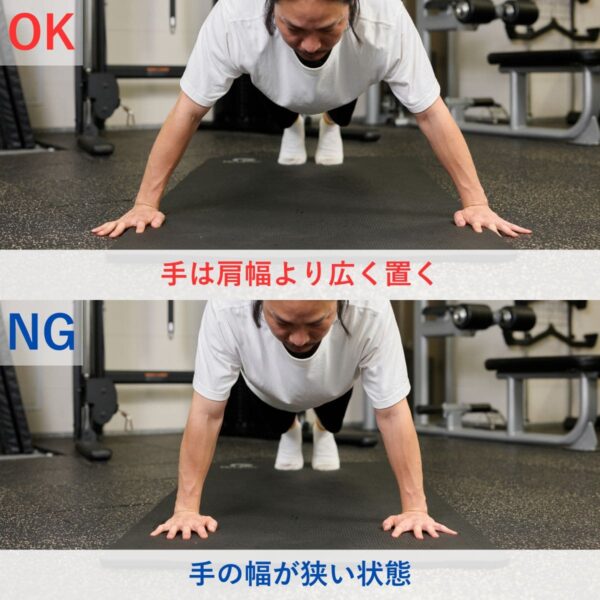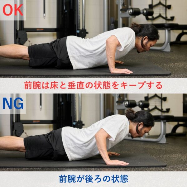 最初に「つま先・お尻・背中・後頭部が一直線」の感覚を作ってから始めましょう。手は体のラインよりやや外で固定し、前腕が常に床へ垂直になる距離感を保つと胸に乗せやすくなります。