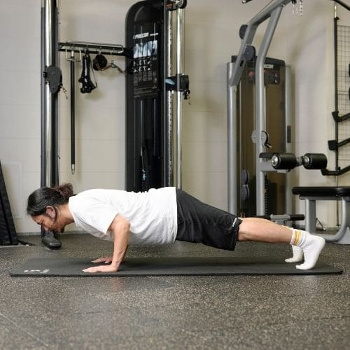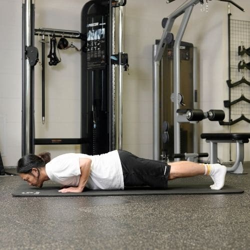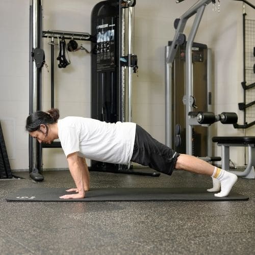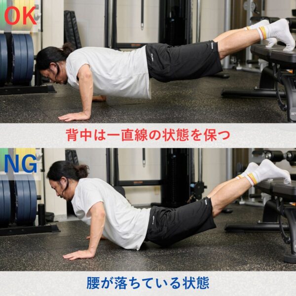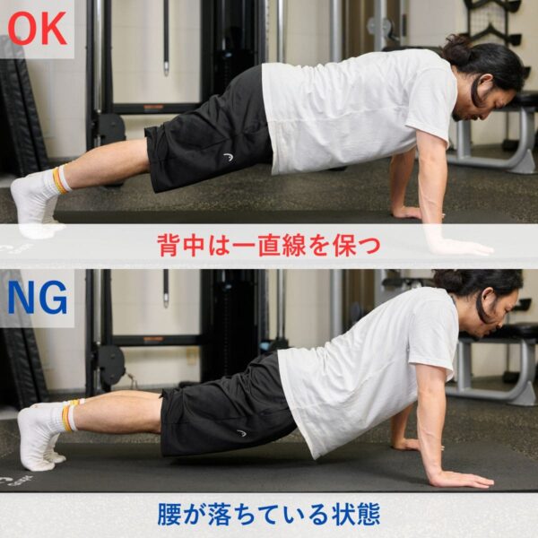 - 身体全体を一直線に保ち、つま先と手のひらで体重を支える
