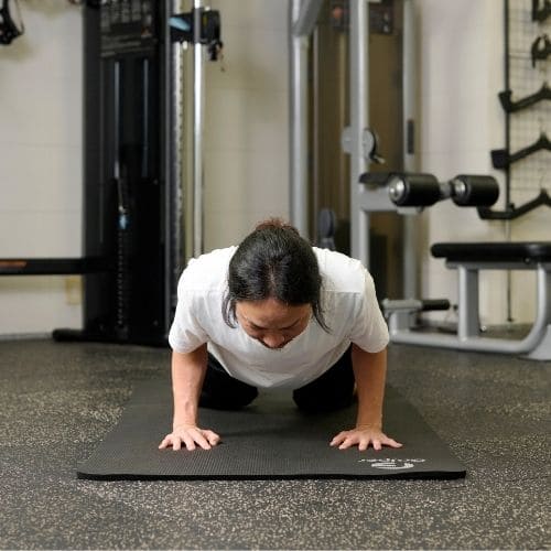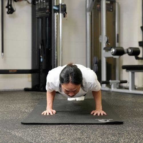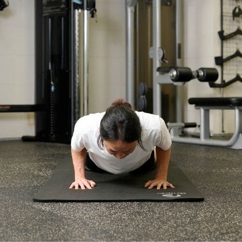 - ひじを曲げて胸が床につくくらいまで降ろす