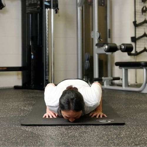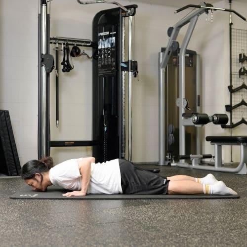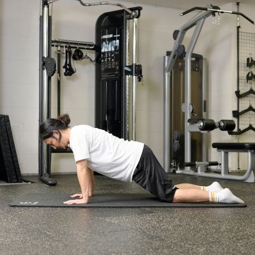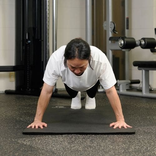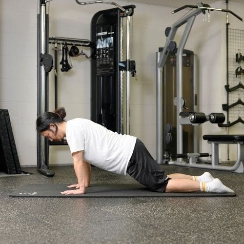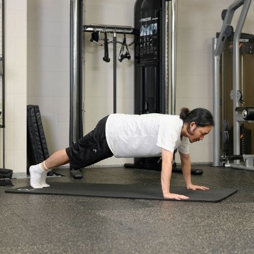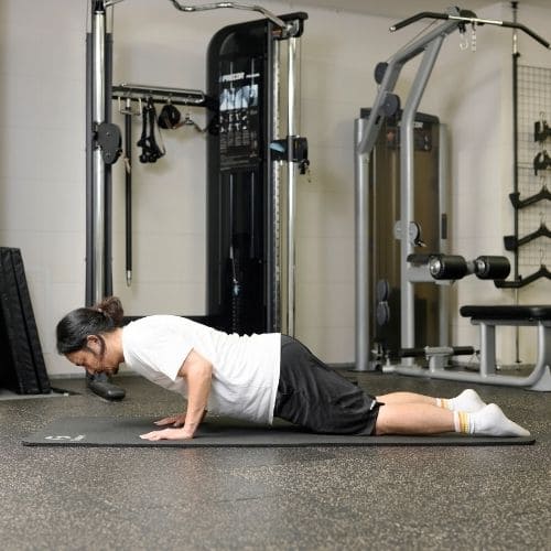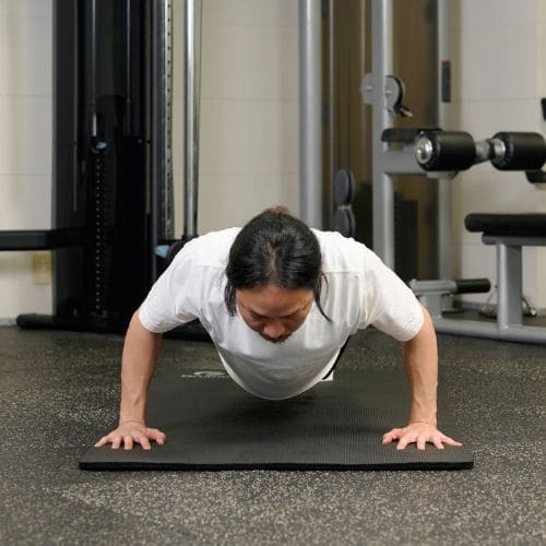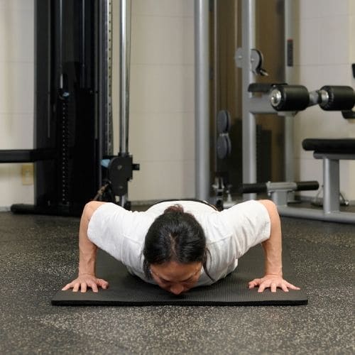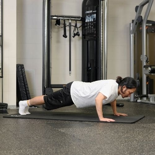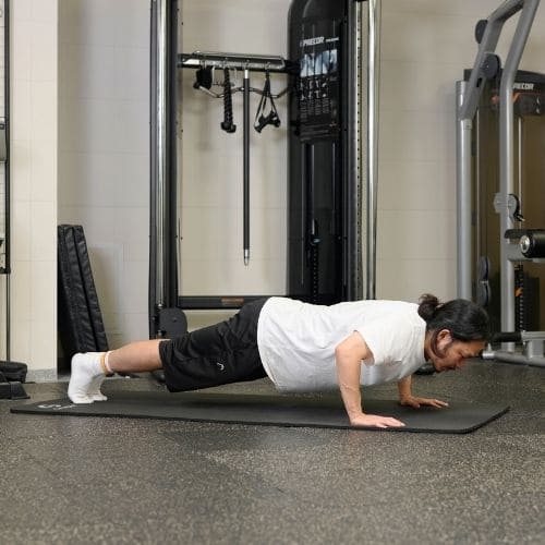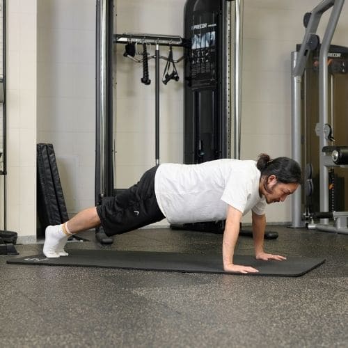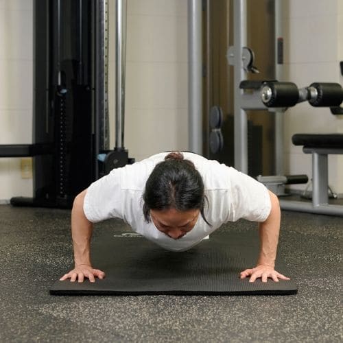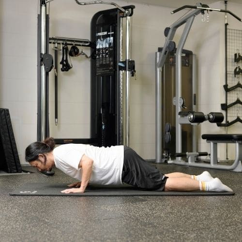 - ひじを開きつつ身体を下ろし、胸が床にほぼ触れるまで下ろす