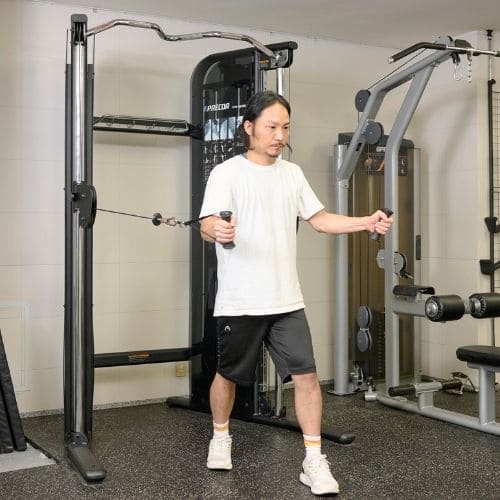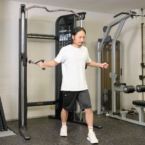 フィニッシュで胸を寄せるように一瞬止め、スタートで胸を開いきましょう。プーリーの高さを調整すれば上部・中部・下部の狙い分けができます。重さよりもフォームとテンポの一貫性を優先してください。