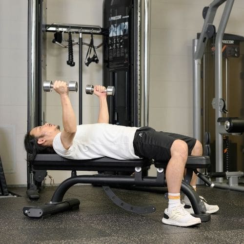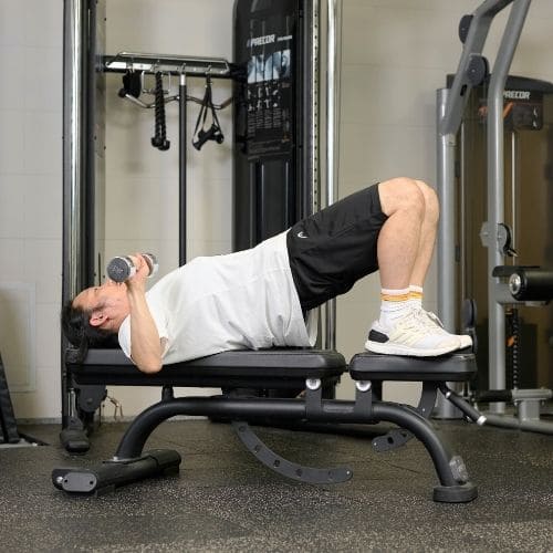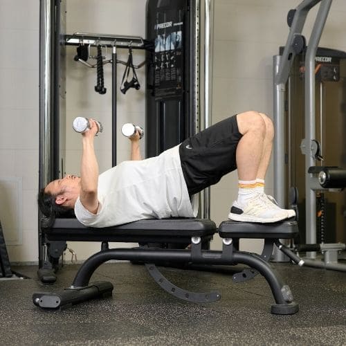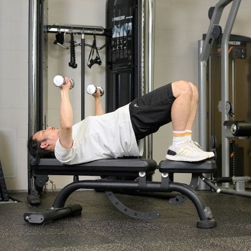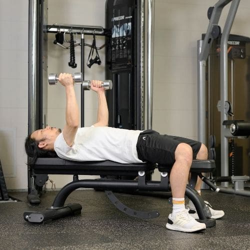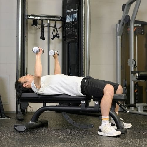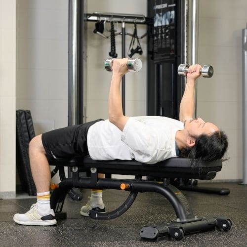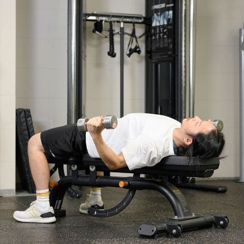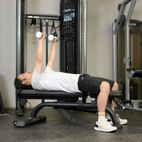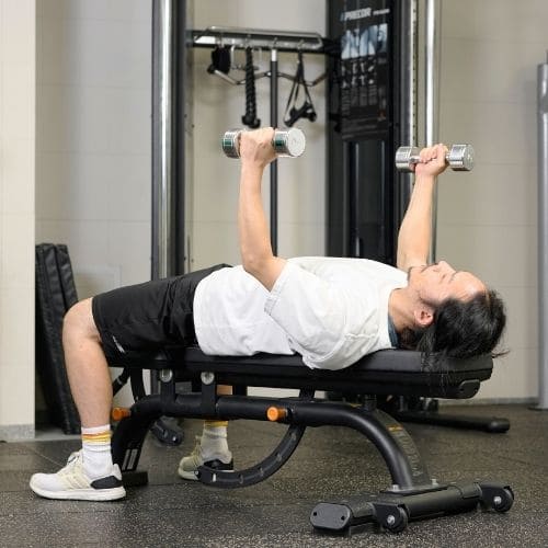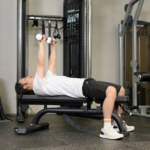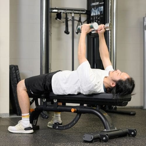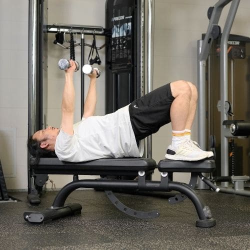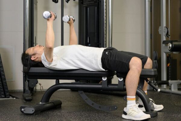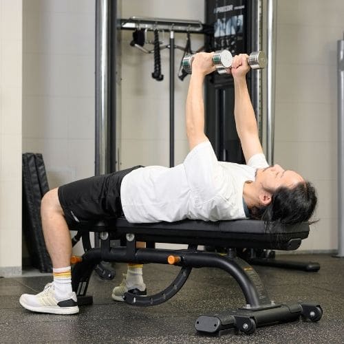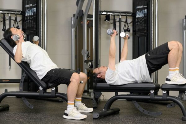 男性は中〜高重量でのプレス種目を軸に厚みづくりを狙い、ダンベルフライでストレッチ刺激も確保します。女性はフォームの安定と肩の違和感予防を優先し、反動を使わずコントロール重視の回数設定で継続するのがコツです。