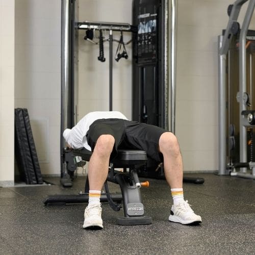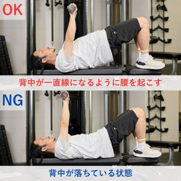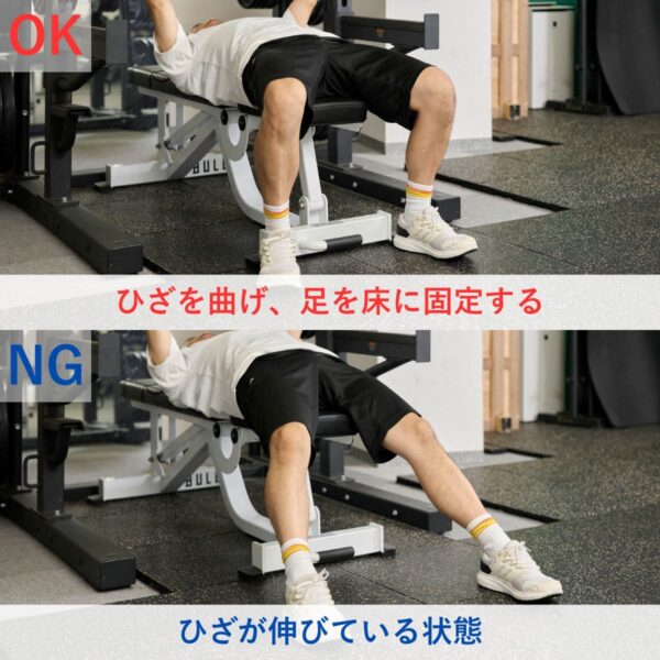 フォームが安定しづらい人は、最初にフラットベンチで肩甲骨を寄せ・胸を張る感覚をつかんでからデクライン体制に入る方法がおすすめです。足とベンチの接地を安定させながらも、過度に腰を持ち上げないことも大切です。