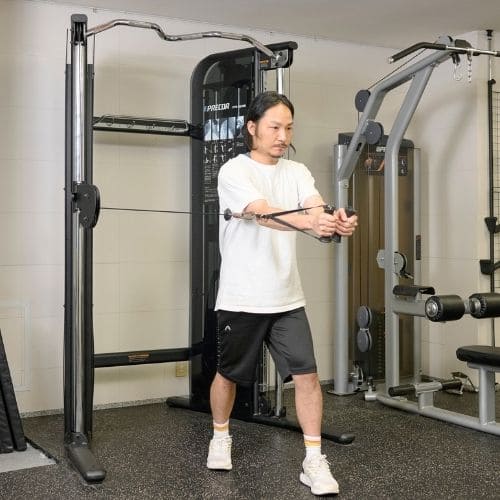 - ケーブルマシンの前に立ち、ハンドルを握る