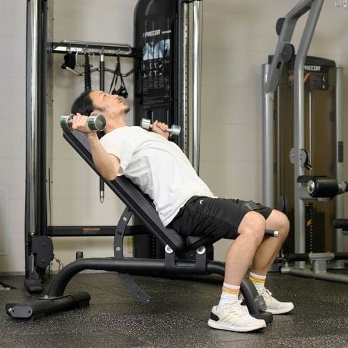 ベンチ角度は30〜45度を目安に、違和感のない範囲で調整します。バーは鎖骨〜胸上部に下ろし、ひじを開き過ぎないことがポイントです。肩甲骨は下げたまま保ち、最初は中重量でフォーム固めを優先しましょう。