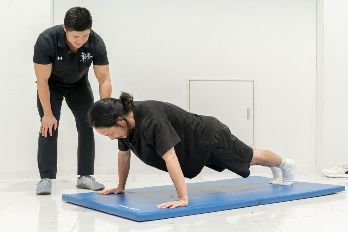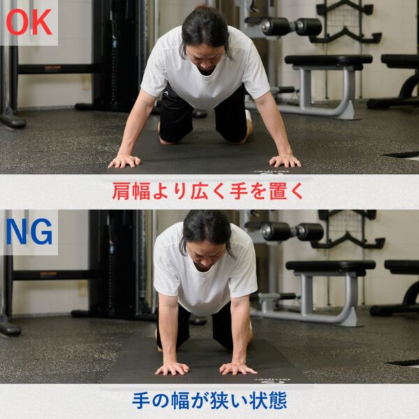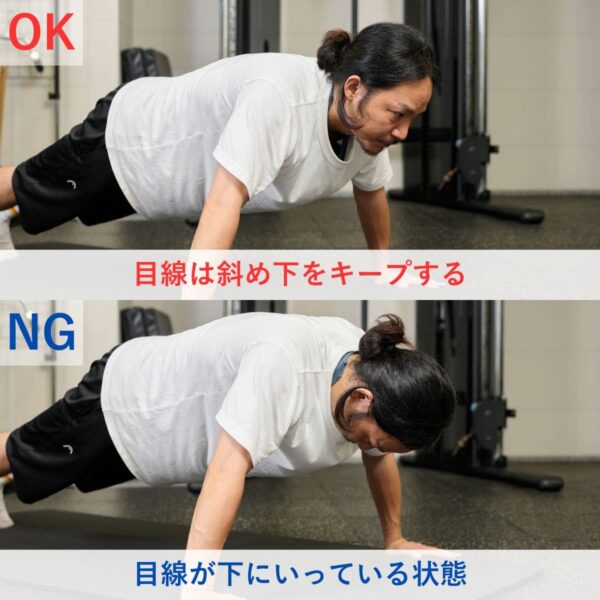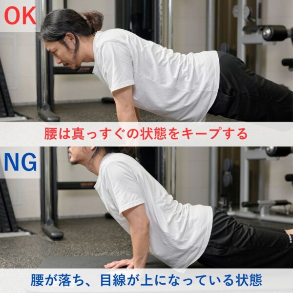 「胸を手の間に落とす→手で床を押す」の意識づけをしましょう。お腹を軽く引き込み、お尻を締めたまま動作すると上半身が一直線に保ちやすいです。