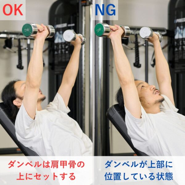 - ① インクラインダンベルプレス:12〜15回 × 2〜3セット