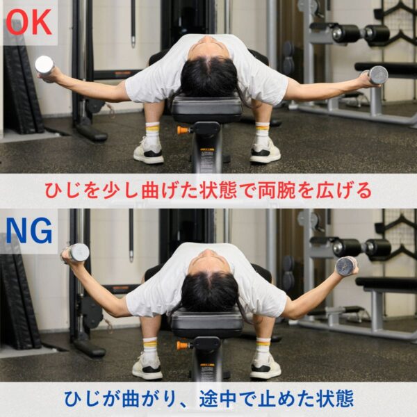 - ② ダンベルフライ:12〜15回 × 2〜3セット