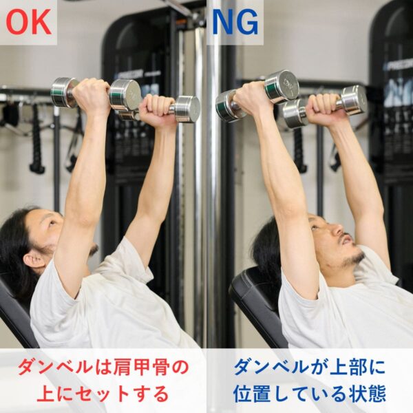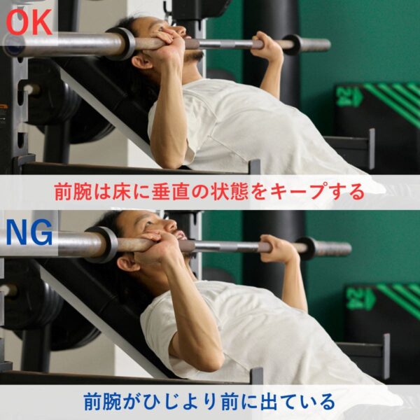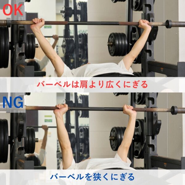 通常のベンチプレスとグリップ幅以外は同じフォームで取り組むようにしてください。肩甲骨のセットを最優先にし、可動域は胸がよく伸びる範囲にとどめましょう。手首は真っすぐ保ち、重量よりも軌道の再現性を重視してください。