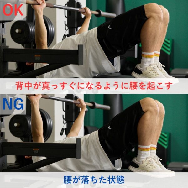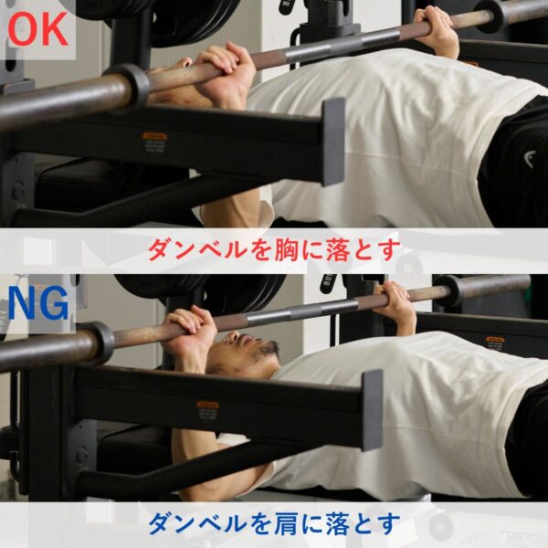 - 肋骨(みぞおち辺り)に向かってバーベルを落とし、持ち上げる