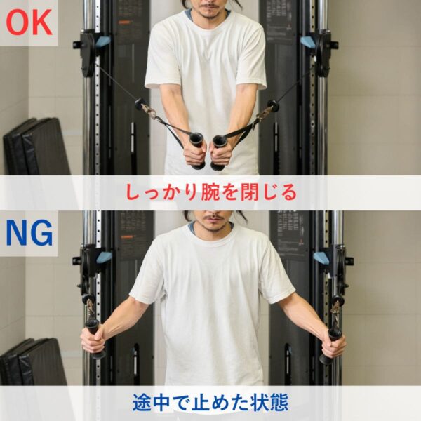 軽めの重量でも胸の内側の収縮が強く、トップで一瞬止めると効きが増しました。勢いをつけると途端に腕に逃げるので、一定のテンポでおこなう方が効果的でした。