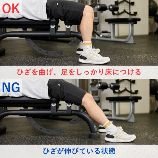 肩甲骨を寄せて下げ、胸を張ったまま足で床を強く踏むことが基本です。大胸筋を狙う場合、グリップは肩幅よりやや広めが最適えす。重量設定は反動なしでコントロールできる範囲から始め、必要に応じて補助者をつけて安全を優先してください。