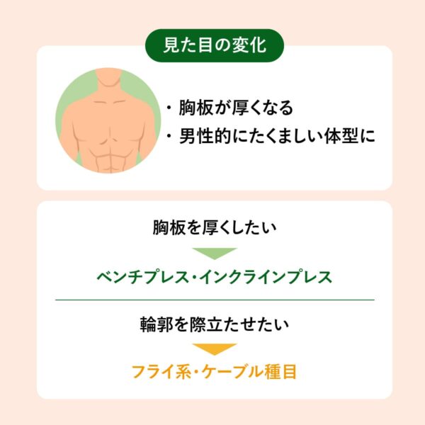 男性は、高重量を扱い、中回数(8〜12回×3〜4セット)で刺激を与えるのが基本。胸板の厚みや立体感を出すこと、押す動作の筋力を高めること、逆三角形のシルエットを強調することが主な狙い。