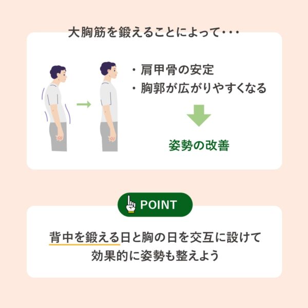 胸の前側だけでなく、背中(広背筋・脊柱起立筋)も並行して鍛えることがポイントです。胸と背中をバランスよく強化することで、肩が自然と開き、胸郭も広がりやすくなります。胸の日と背中の日を交互に設けるのも、姿勢改善の観点から効果的です。
