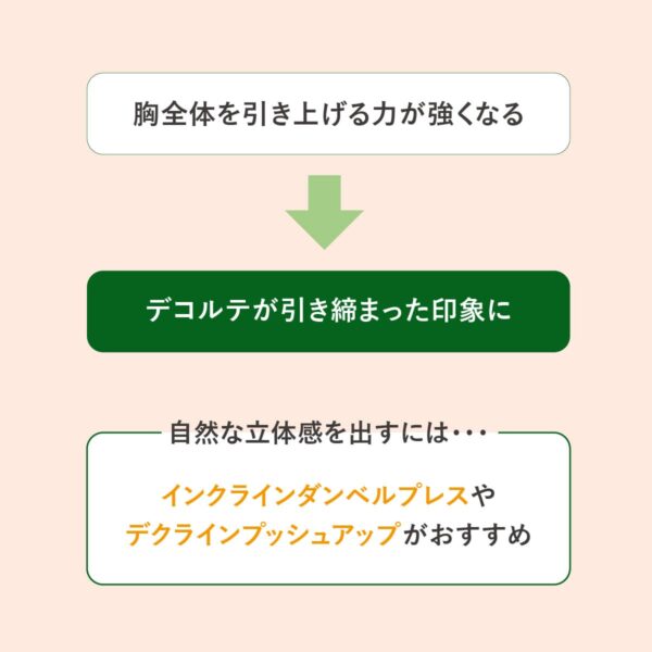 デコルテライン(首筋から胸元にかけてのライン)の美しさには、鎖骨まわりの大胸筋上部が大切。また、大胸筋上部を鍛えると胸全体を引き上げる力が強くなり、胸元が垂れるのを防いでデコルテが引き締まった印象になる。