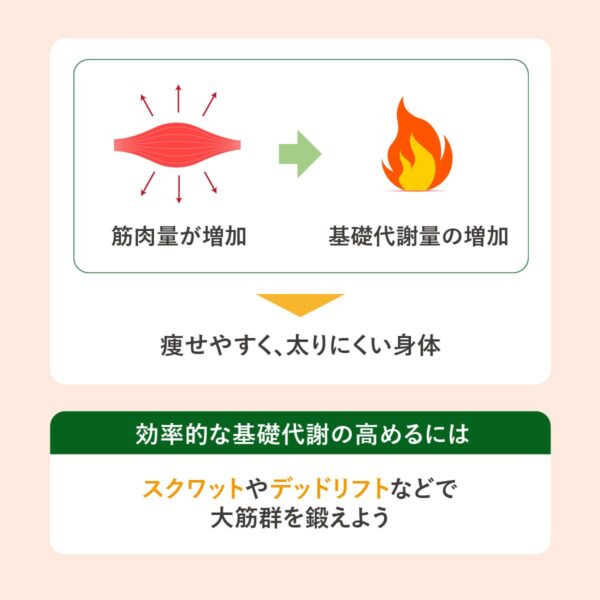 基礎代謝を効率的に高めたいなら、大胸筋に加えて「脚(スクワット)」「背中(デッドリフト)」といった大筋群を鍛えることが有効です。大きな筋肉を複数同時に鍛えることで、消費エネルギーが増し、日常の代謝も底上げされます。