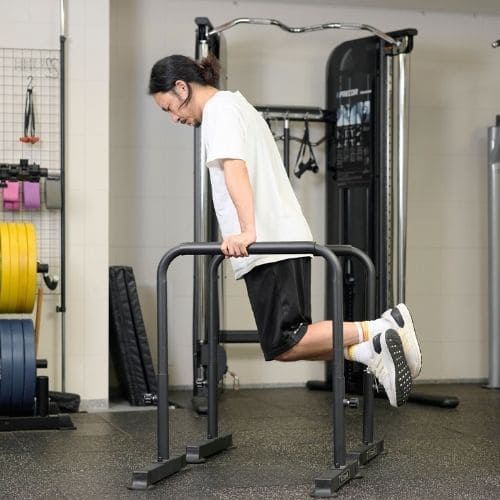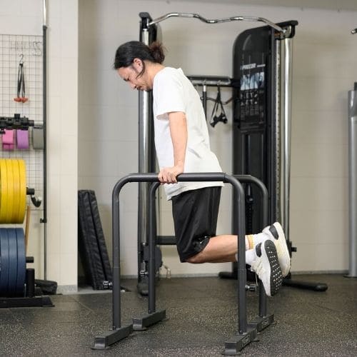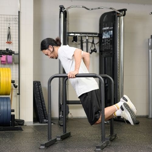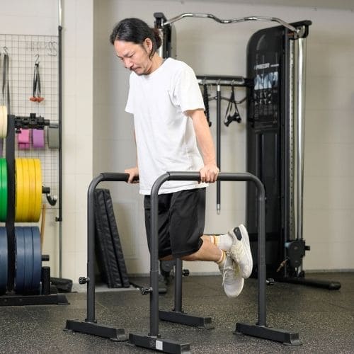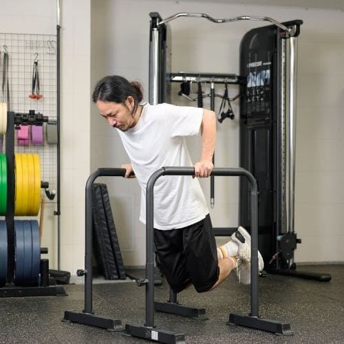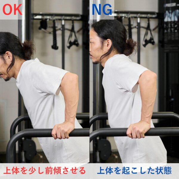 ディップスは大胸筋下部・三頭筋に刺激を与えますが、同時に肩関節への負担も大きくなる種目です。慣れてきたら加重ベルトで負荷を高めるのも効果的です。