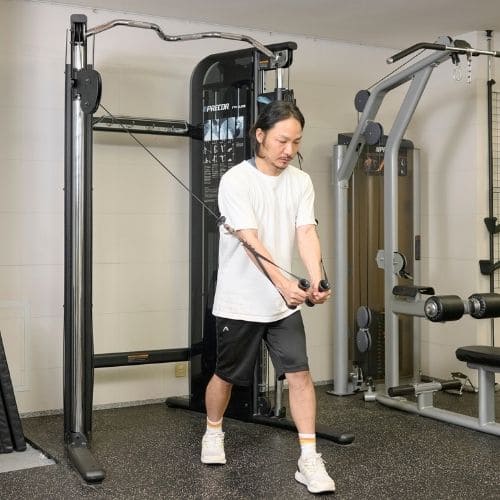 - ケーブルマシンのハンドルを上方(ハイ)の位置にセットする