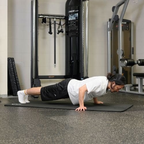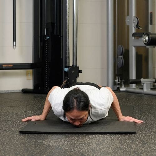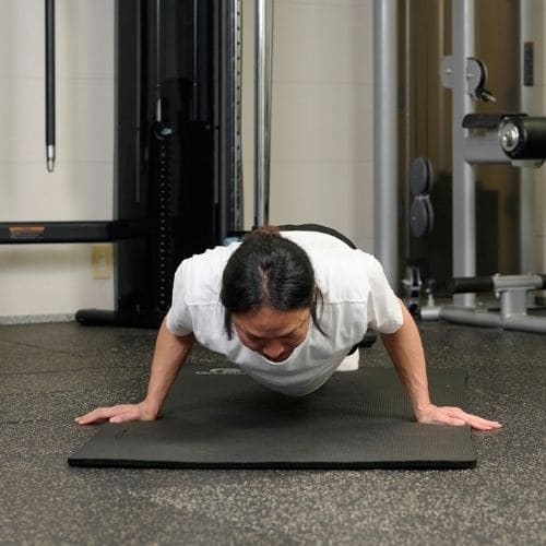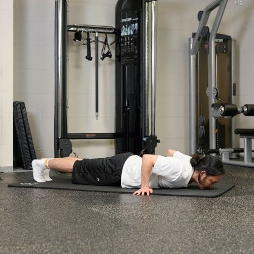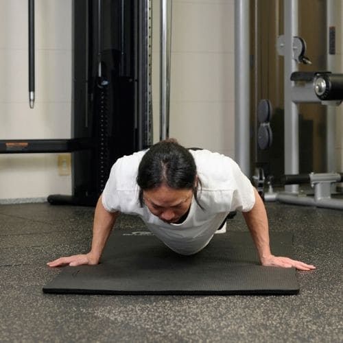 体を下向きにしておこなうので最初は感覚がつかみにくかったですが、慣れると胸の下部にしっかり刺激が入るのを実感できました。安定感がやや難しい分、フォームを崩さない意識が重要だと感じました。