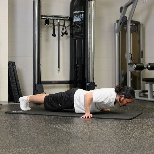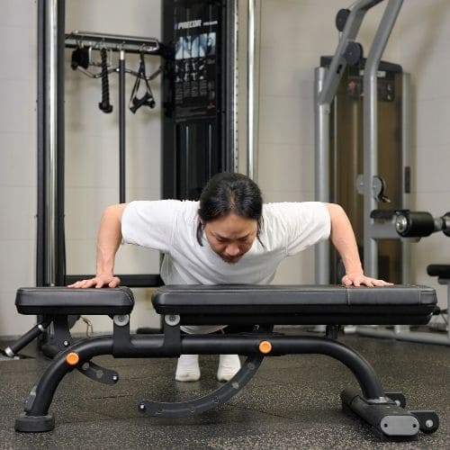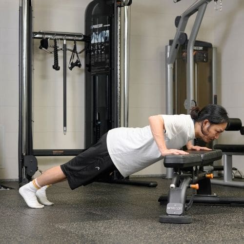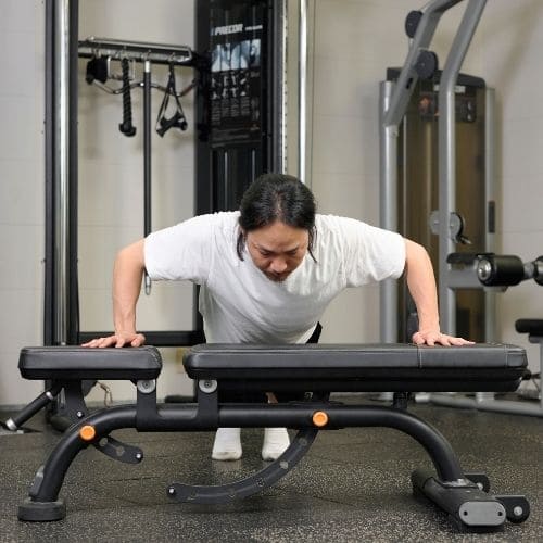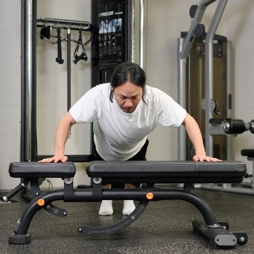 下部に効かせるためには、押す軌道をやや下方向に設定することが大切。デクラインベンチや手の位置を上げたプッシュアップなど、自然に下向きに押せる角度を作ることで、下部への刺激が入りやすくなる。角度が浅すぎると中部への負荷が強くなる。
