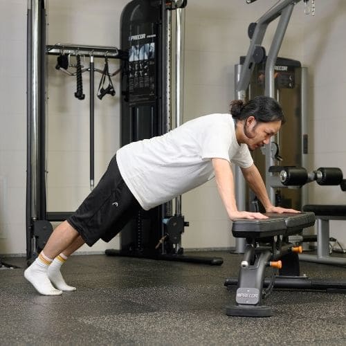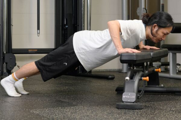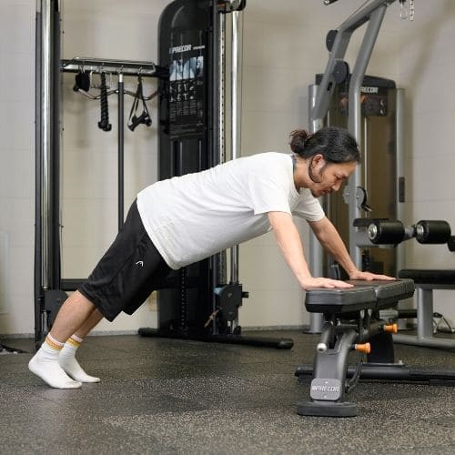 手を台や段差の上に置き、体を斜め下方向にして腕立て伏せを行う。押す軌道が下向きになる種目。20~30回×3セットが目安。