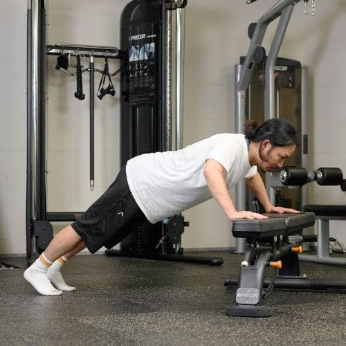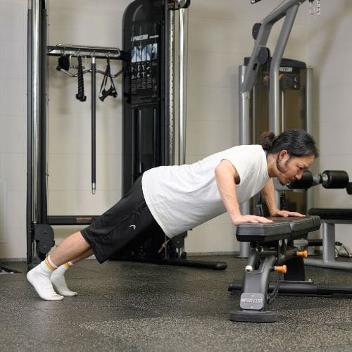 足を椅子や台の上に置き、体を斜めにした状態で腕立て伏せを行う。押し出す軌道が上向きになり、大胸筋上部に刺激が集中する。10〜12回×3セットが目安。