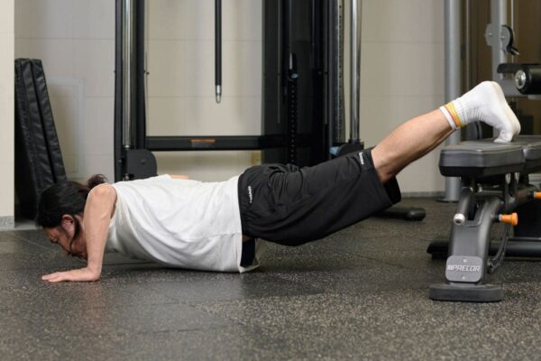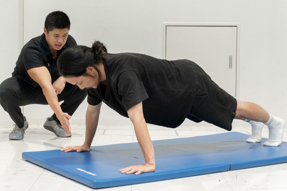 胸のバランスを整えるには、下部だけでなく中部や上部も同時に鍛えることが大切。腕立て伏せは手幅や足の高さを変えるだけで、刺激を入れる部位を簡単に切り替えられる。