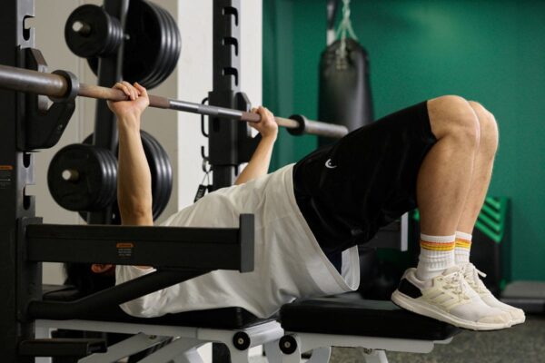 通常のベンチプレスに比べてバーを下ろす位置が低くなるため、大胸筋の下部に強く効いている感覚がありました。特に押し上げ動作で胸の下からグッと押す力が必要になり、三頭筋にも負荷を感じました。一方で、足の位置や腰の浮かせ方が不安定だとフォームが崩れやすく、重さをコントロールするのが難しかったです。