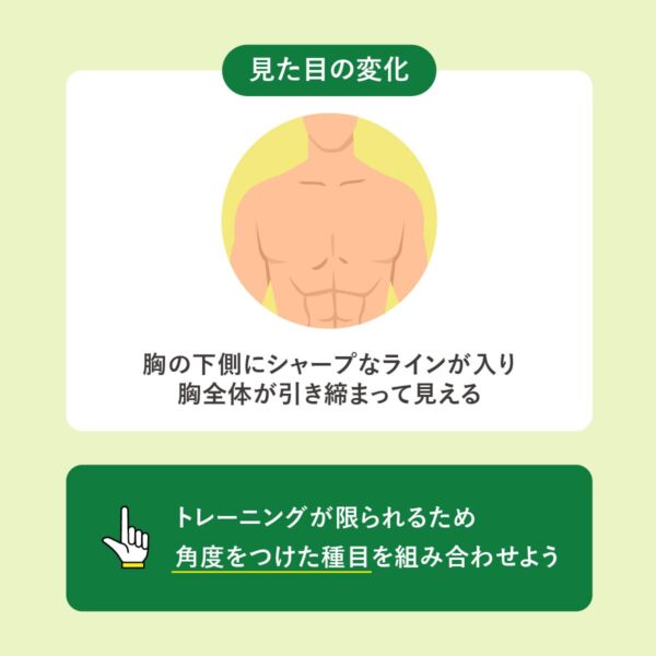 下部が発達すると、胸の下側にシャープなラインが入り、胸全体が引き締まって見える。Tシャツやタンクトップを着たときに胸の輪郭がくっきりするようになる。下部を仕上げることで立体感が増し、完成度の高い胸板になる。
