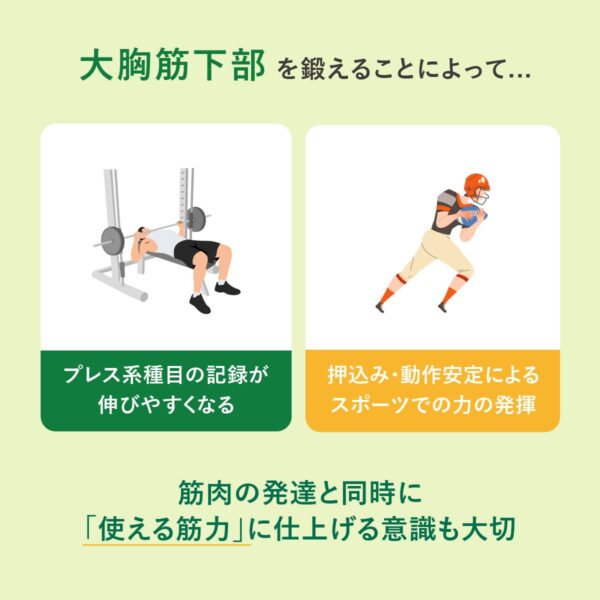 大胸筋下部は、押し出す・押し下げる動作に深く関与している。鍛えることでデクラインベンチプレスやディップスなどの記録が伸びるだけでなく、格闘技の押し込み、ラグビーやアメフトのタックル、体を支える動作などが安定する。