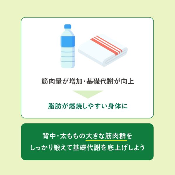 胸だけでなく、背中や太ももなどの大きな筋肉群をしっかり鍛えることで、基礎代謝が底上げされ、長期的な体質改善につながります。