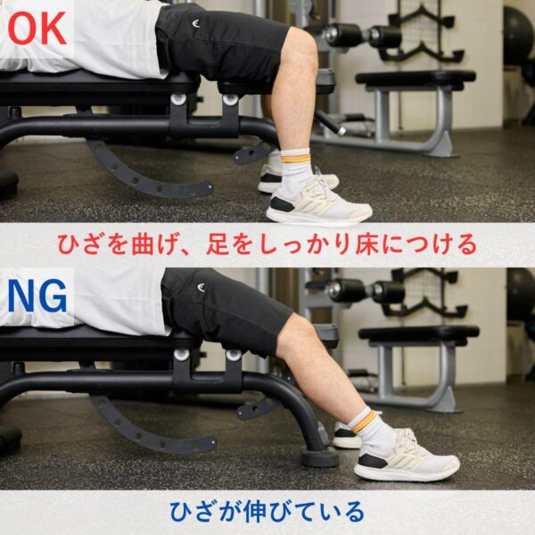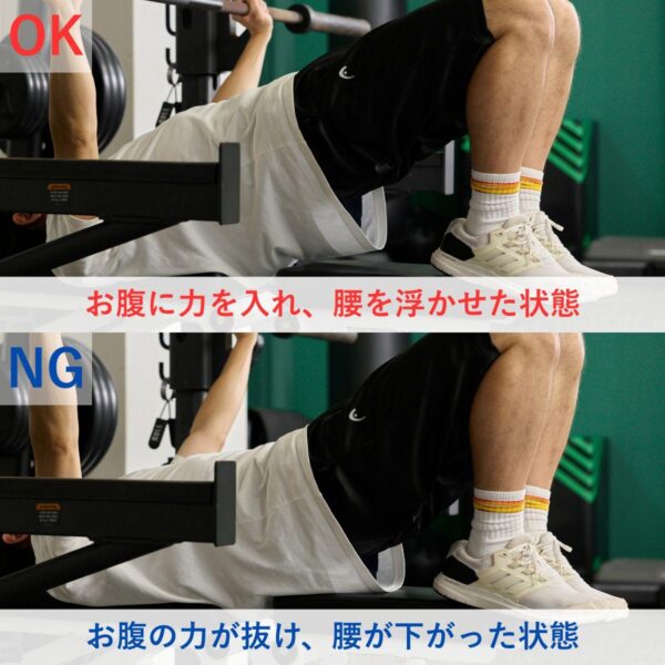 通常のベンチプレスでも大胸筋下部にアプローチできますが、デクラインにすることでより大胸筋下部にフォーカスできます。腰を持ち上げる際にお腹にしっかり力を入れ、肩をベンチに固定しておくことが大切です。